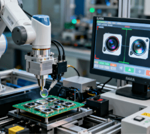 Chip Assembly: Pick-and-place robots with vacuum nozzles (as small as 0.2mm) assemble microchips onto PCBs at a speed of 10,000 components per hour.